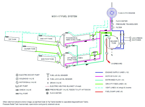The aircraft has a maximum takeoff weight (MTOW) of 22,000 lb. and a zero fuel weight with pilot of 3,700 lb., meaning that 83% of the MTOW is fuel, or conversely only 17% of it is not fuel. The structural fraction is lower than probably all other airplanes, and is especially impressive with a spindly wing aspect ratio of 32.5:1. Lift-to-drag ratio is estimated at 37. The composite-material Voyager has been the exemplar of combined structural and aerodynamic efficiency, and had a zero fuel weight fraction of 28%. GlobalFlyer is a remarkable 39% less than that. It is also made mainly of graphite-epoxy composite, mostly in honeycomb form. One reason that GlobalFlyer is relatively lighter is the turbofan engine, which has higher thrust-to-weight ratio than Voyager's piston powerplants. Another reason is that much of Voyager's structure was thicker than needed because of minimum gauge limits; the bigger GlobalFlyer doesn't carry this extra weight. The powerplant is a single 2,300-lbf. Williams FJ44-3 ATW turbofan. The fuel system has 13 tanks--six per side and one 31-gal. header tank in the aft fuselage that supplies the engine (see drawing, p. 49). Each side has a forward and aft boom tank with jet pumps that keep the header filled. An automated fuel transfer system switches among the boom tanks to maintain lateral and longitudinal balance. The boom tanks include sections inside the inboard wing. Each outboard wing has four fuel tanks that gravity-feed into the boom tanks by pilot-controlled valves.