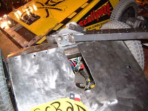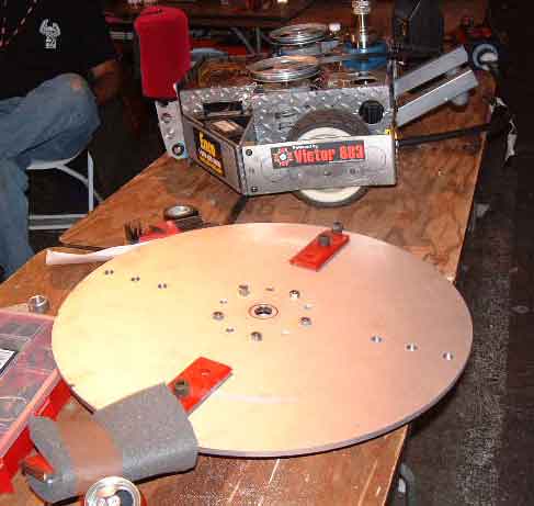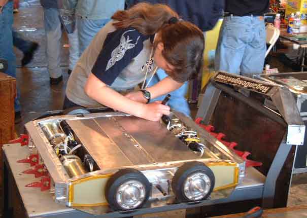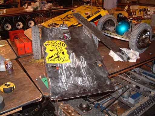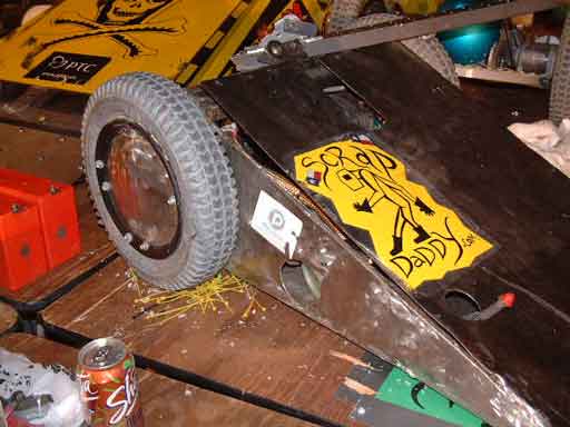 Michelle inspecting Omega-13 prior to its bout.![]() This bout was against a veteran bot "Bender". This bot supports a large horizontal rotating disk, spinning at 2000 RPM. The disk has 2 steel teeth bolted on which are used to destroy the opponent. Brent modified Omega-13 by removing the back spikes and instead installing a steel bar. Brent charged Blender with the steel bar end of Omega-13, resulting in one of Blender's teeth breaking off. This resulted in the rotating disk going unbalanced and throwing off the drive belt, causing the disk to come to a stop. Brent proceeded to bash the defenseless Bender all over the place. Unfortunately, in the process Omega-13 received some serious hits from the kill saws, resulting in damage to the titanium armor and one of the wheels. The spectacular shower of sparks from the kill saws hitting the titanium armor has virtually guaranteed that this bout will get televised, or so I think. Picture 5 below shows Bender after the bout and with the spinning disk removed. The broken blade is visible on the far side of the disk, while the intact blade is visible in the foreground, covered with foam. Picture 6 below shows a close up of the fractured blade.In the post fight inspection of T-Wrex, we recovered several pieces of Scrap Daddy from the wheel wells of T-Wrex. Other than the debris, there was no internal or even cosmetic damage to T-Wrex. T-Wrex will be ready to take on its next challenger as soon as the batteries are topped off. ![]() ![]() Unfortunately Omega-13 did not fare as well. It appears that in addition to the severe damage to the armor, two of the motors have sustained some sort of damage. We have enough parts to get Omega-13 ready for its next bout, but we are gravely concerned about the continuing problems. Fortunately the events organizers realized the burden they were imposing on everyone by not publishing the schedule. They have now published a time for every bout between now and the end of the tournament. T-Wrex's next bout is Sunday at 1:00, while Omega-13's next bout is at 9:00PM. Omega-13 goes against another first-timer called BOB (Basher Of Bots). Since its builders are local, they have been moving the bot back to their workshop after each bout, so we do not have much information about it. T-Wrex on the other hand goes against a well known veteran, "Bad Attitude". Bad Attitude was the runner up in the last tournament and lost in the finals while significantly ahead, after getting stuck on the spike strips. It is a solid, well-built, wedge design and is driven by a mature (a.k.a. senior citizen) and experienced driver. The outcome of the bout will come down to one thing: driving skill. If Alain can out-drive his opponent, Alain will become the undisputed "best driver in BattleBots", as well as winning a guaranteed televised match (all quarterfinals are televised). As one of the top 16 bots, T-Wrex has already won a spot in one of the rumble matches. Sunday will be another slow day with just these two bouts and lots and lots of bot repairs. If both the bots win and make it all they way to the finals, we are looking at a total of 9 bouts on Monday. As hectic as that sounds, we will all love to be in a position to have to endure that kind of a day! |